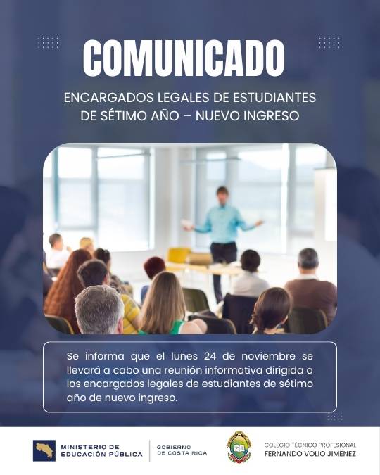 Reciban un cordial saludo. Por este medio se informa que el lunes 24 de noviembre se llevará a cabo una reunión informativa dirigida a los encargados legales de estudiantes de sétimo año de nuevo ingreso.